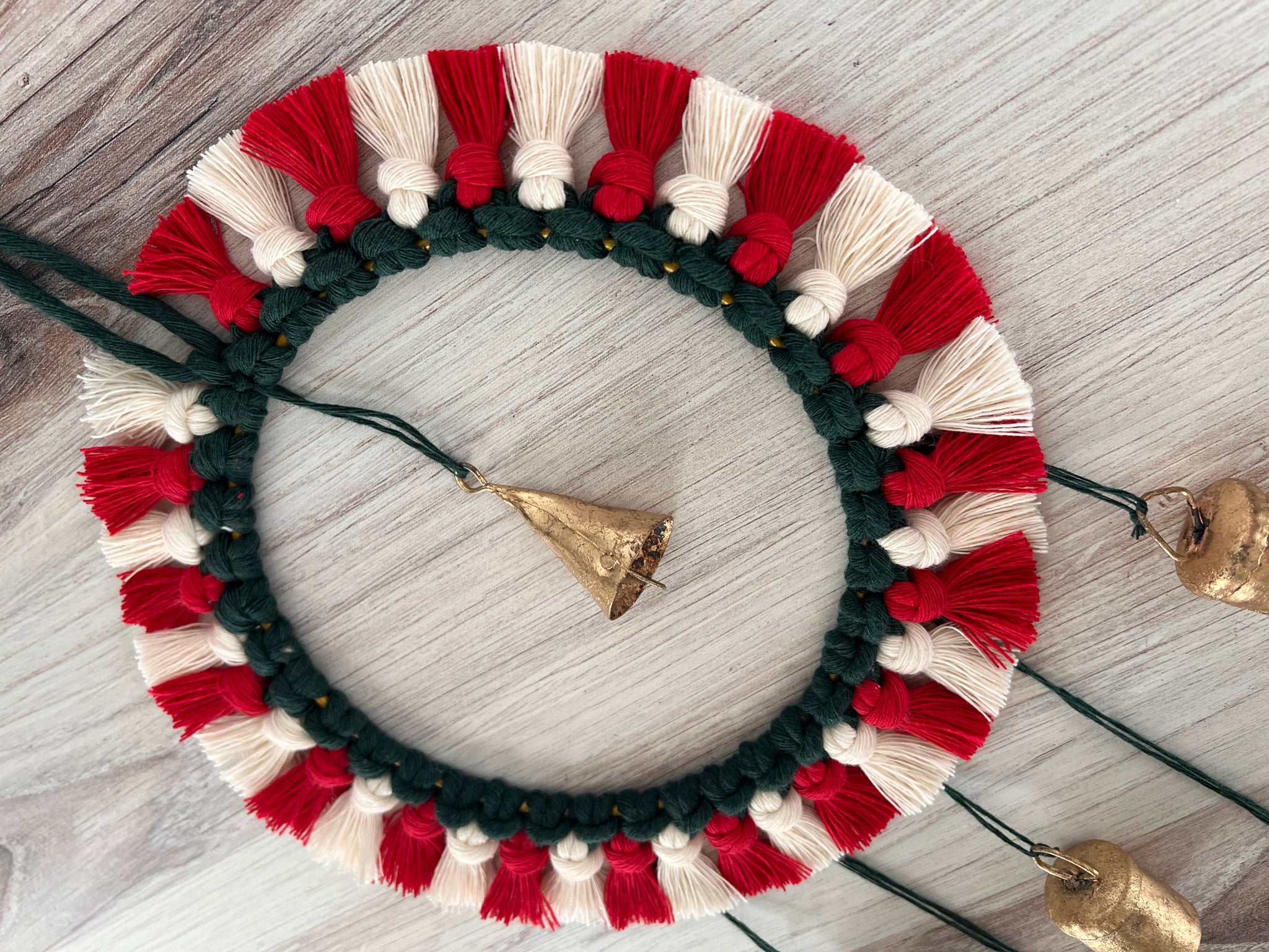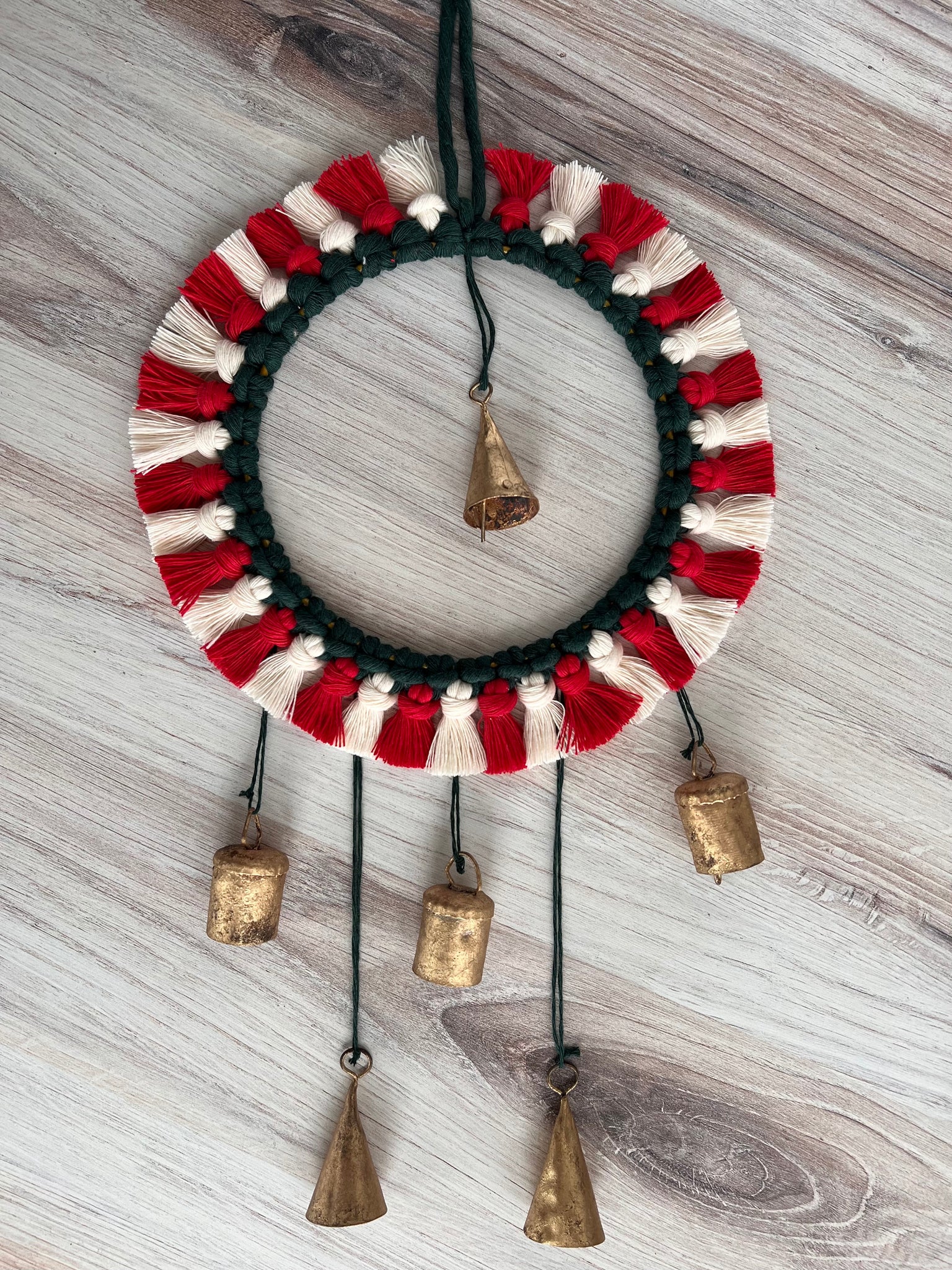 I love the Jim Carrey Grinch and this wreath reminds me of the movie! This wreath is made from recycled cotton cord and handmade brass bells. Mixed red and white fringe all the way around.