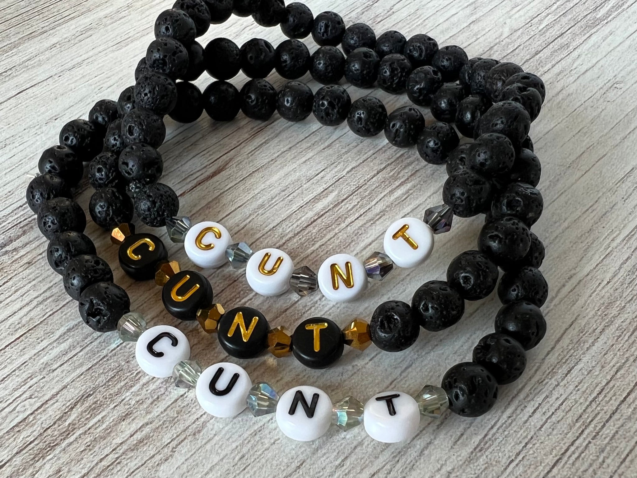 These bold cuss word bracelets are the perfect mix of badass and playful, featuring natural lava rock beads, sparkling bicons crystals, and cheeky letter beads strung together on durable elastic cord.