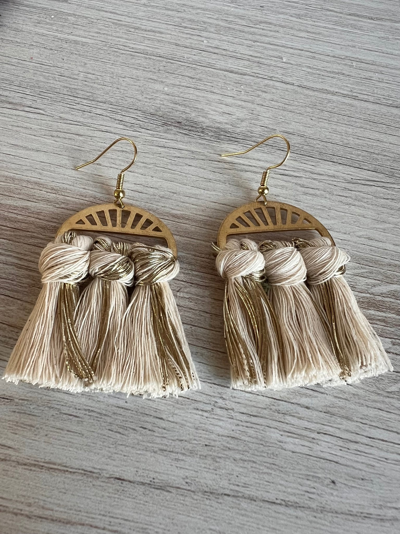 A soft, wintery neutral featuring natural cotton macramé cord accented with gold metallic fibers. This elegant pair is stunning for Christmas celebrations, holiday parties, and New Year’s Eve outfitsoffering just the right amount of shimmer.