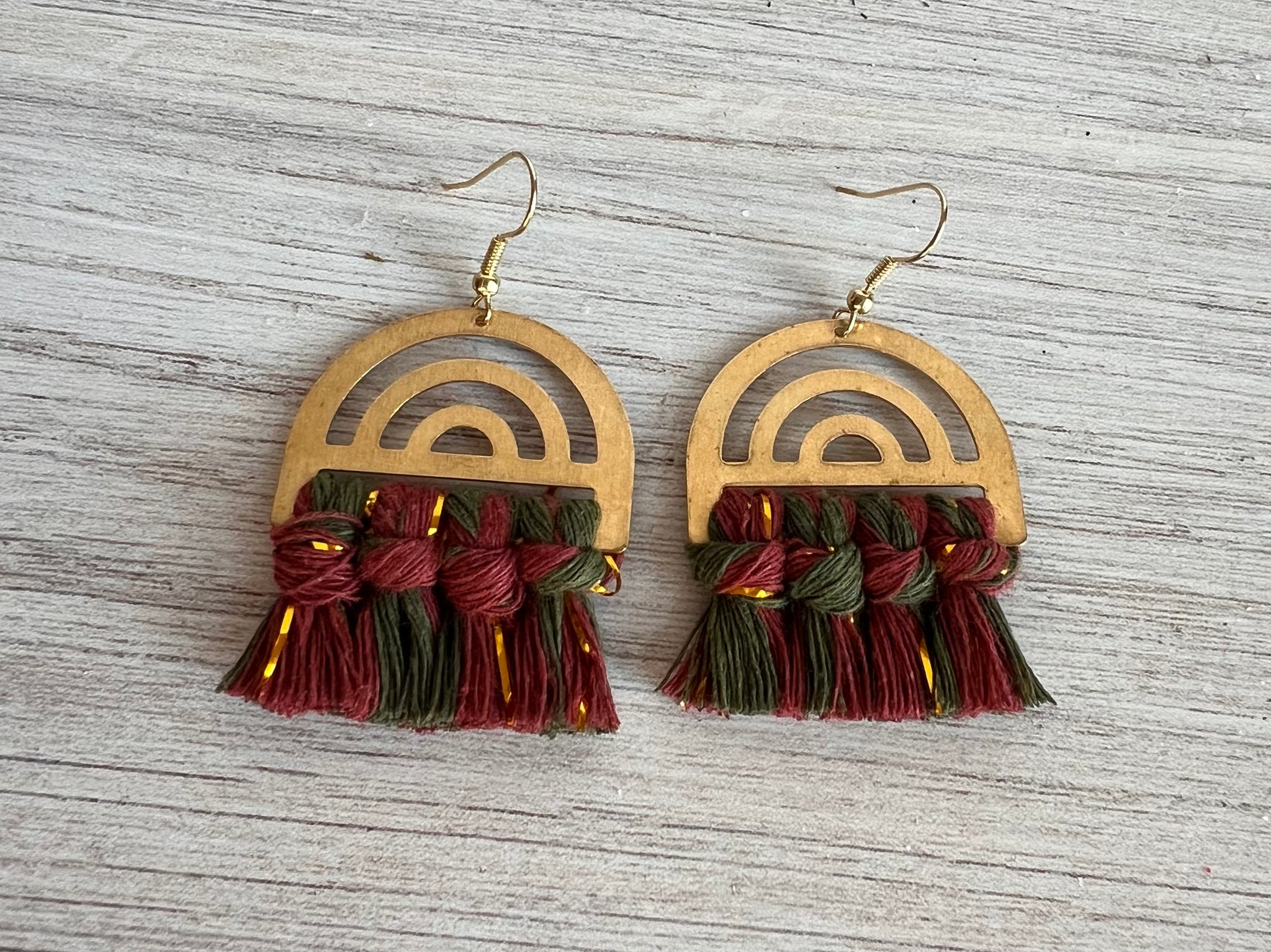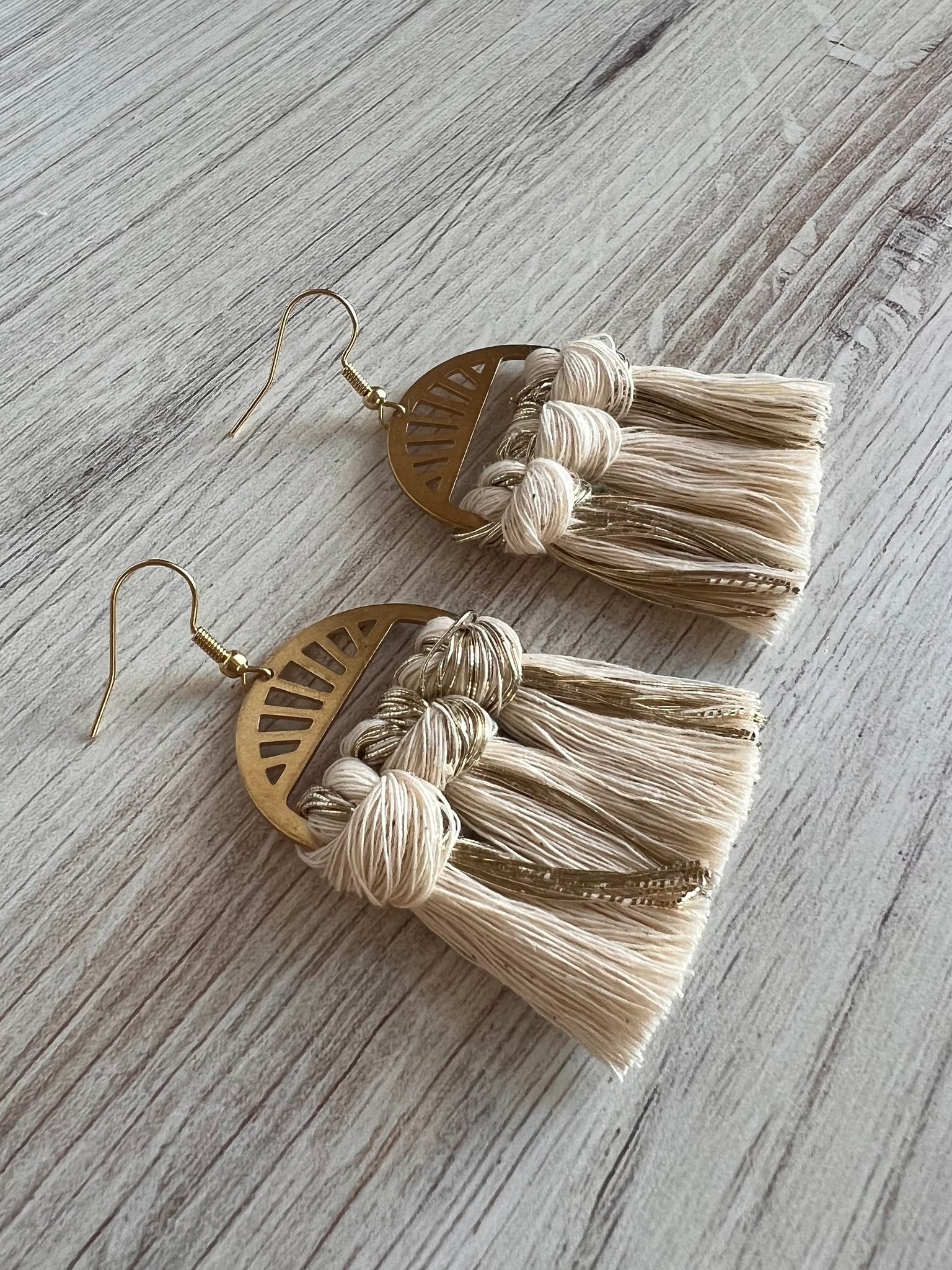 Celebrate the season in style with these handcrafted boho tassel earrings. Perfect for holiday gatherings, Christmas festivities, and sparkling New Year’s Eve outfits. Each pair is made with soft cotton macramé cord woven with metallic fibers for a festive shimmer, paired with warm brass components for a beautifully earthy yet elevated look. Lightweight and comfortable, these earrings add the perfect touch of cheer and movement to any winter wardrobe.