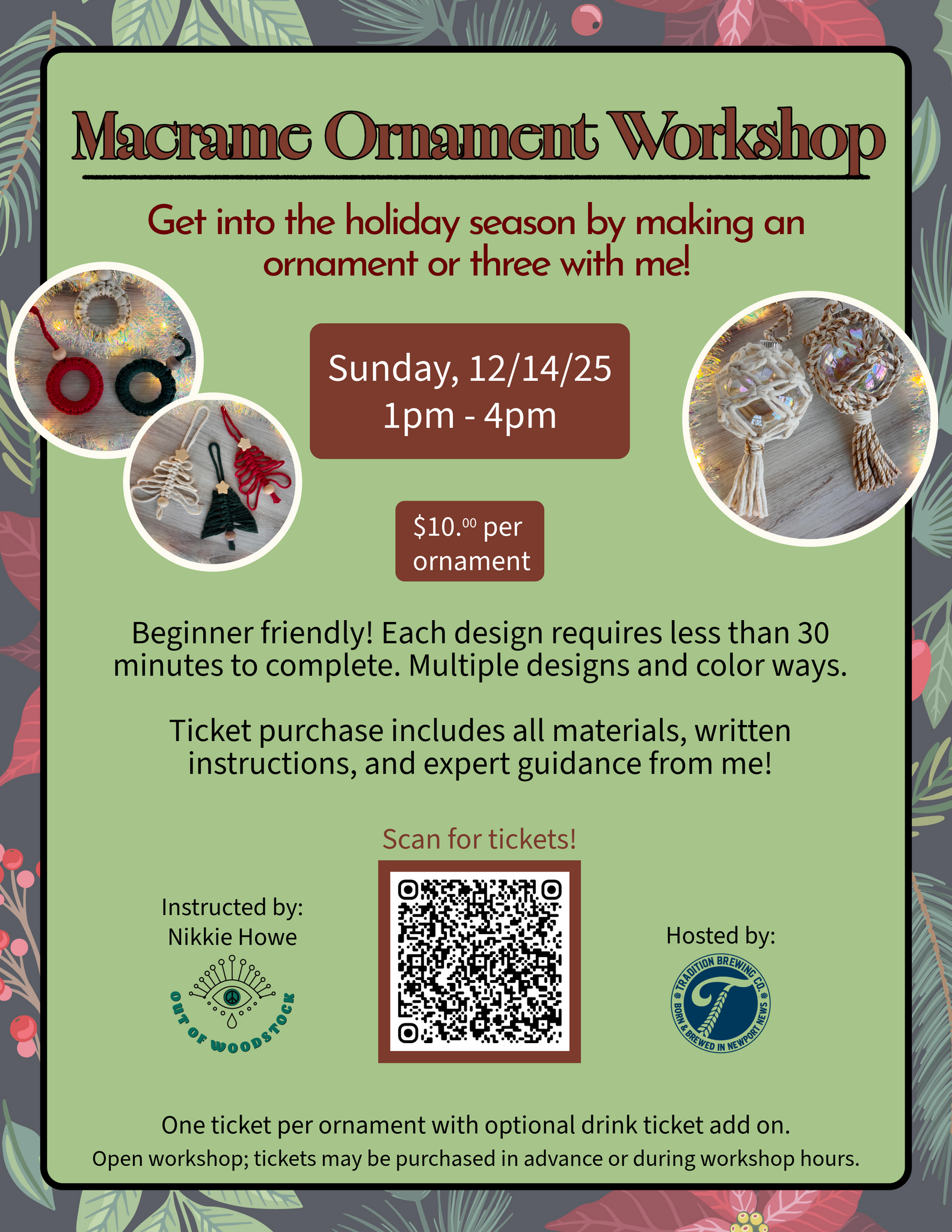 Discover the perfect blend of creativity and celebration at this beginner friendly macrame ornament workshop hosted at Tradition Brewing in Newport News. Craft festive holiday pieces while enjoying Tradition's welcoming atmosphere and delicious drinks!