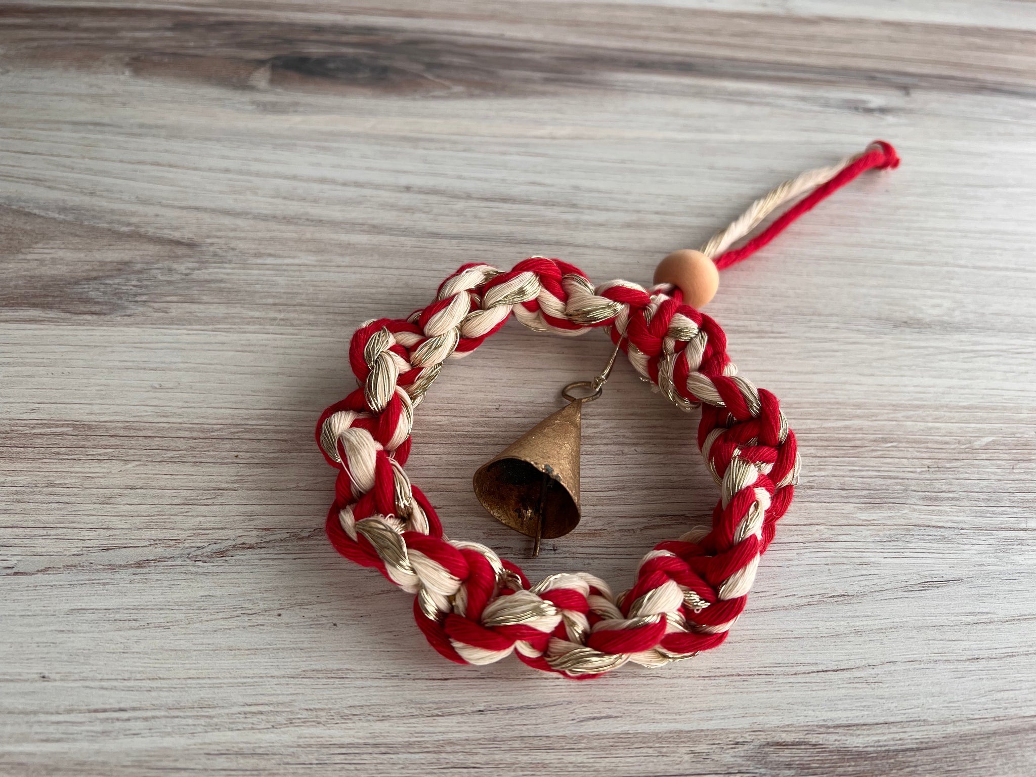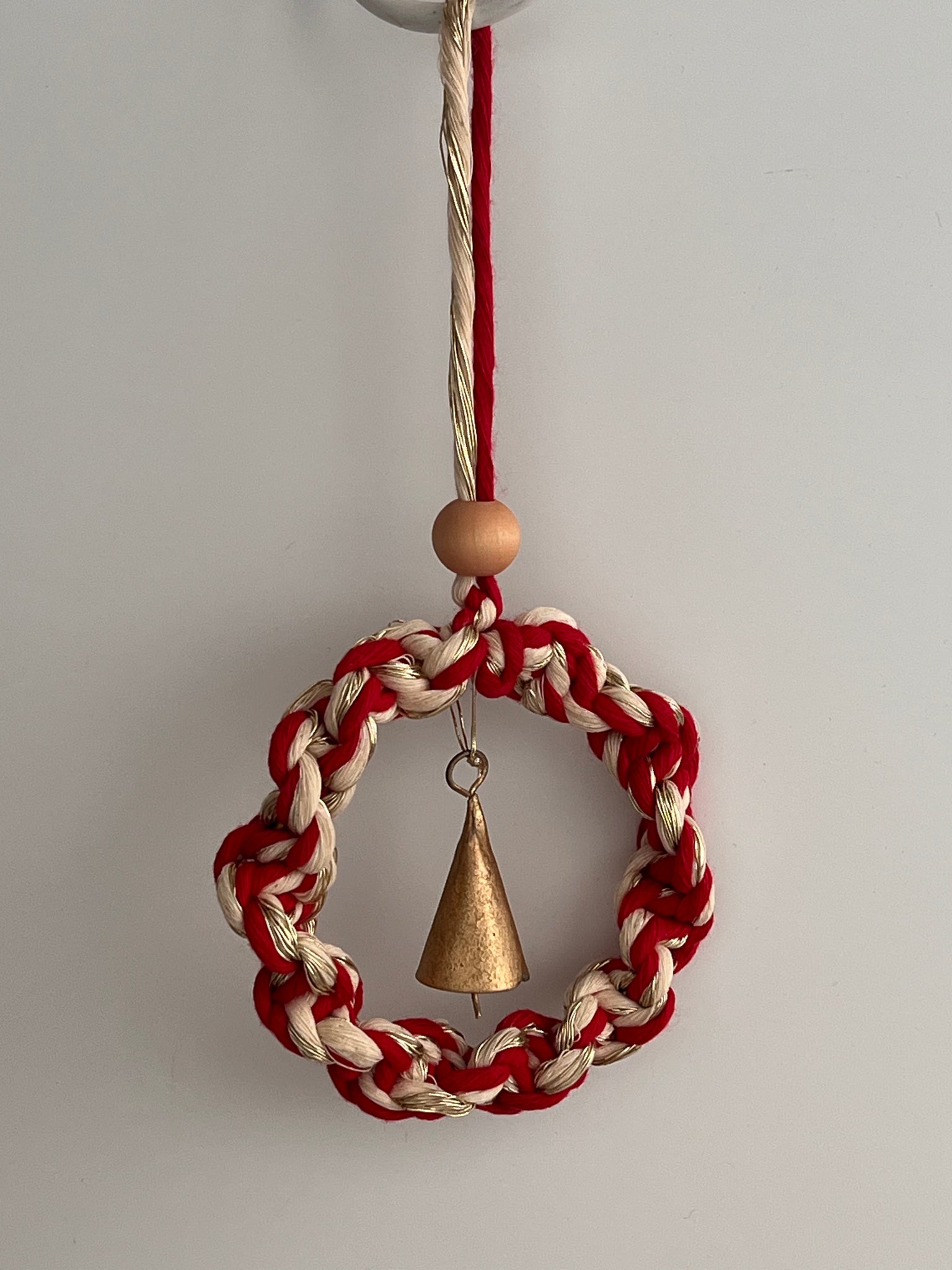 This wreath is made from recycled cotton cord and handmade brass bells. Mixed red, gold and white all the way around. Perfect size for a holiday door hanger