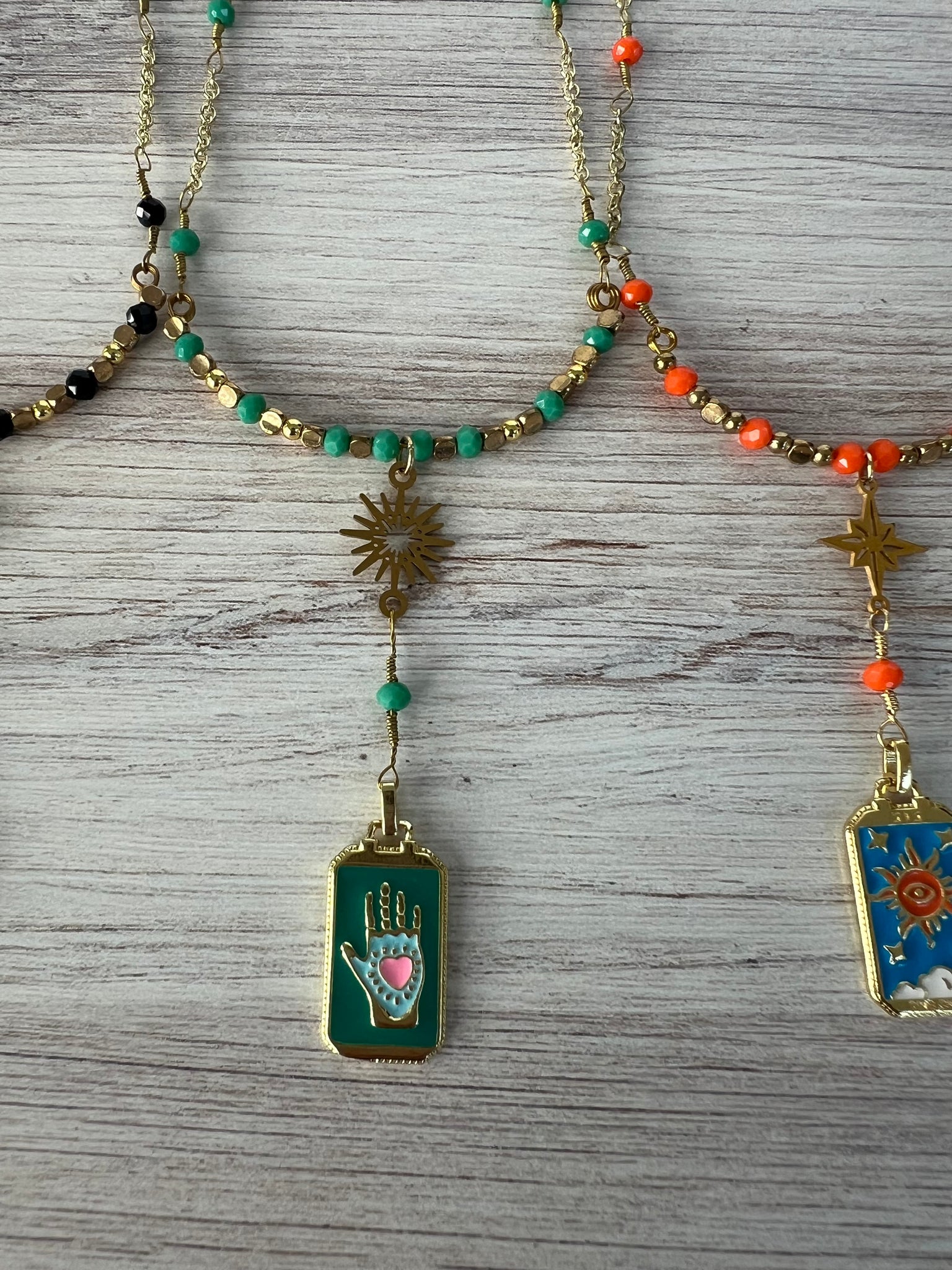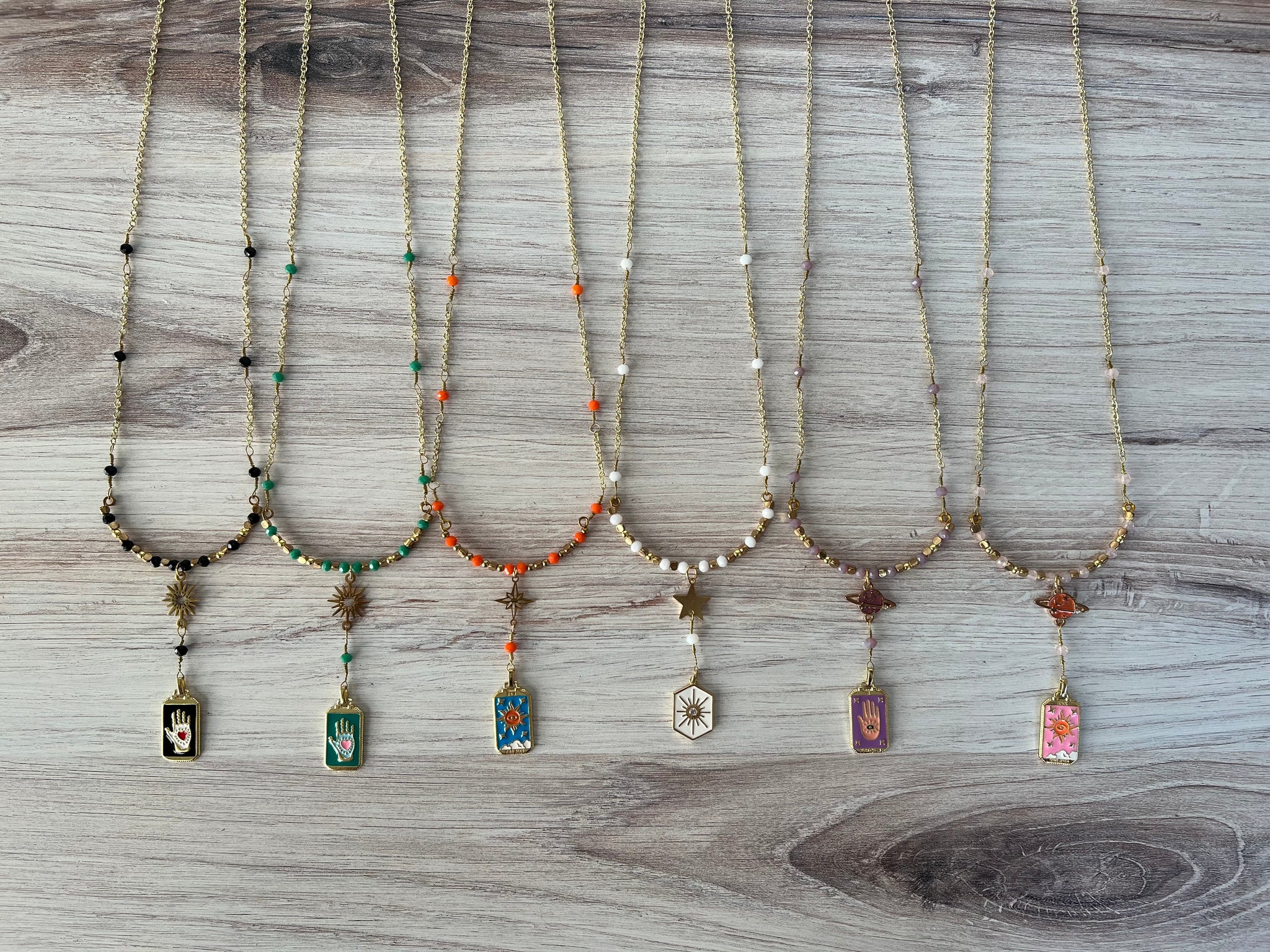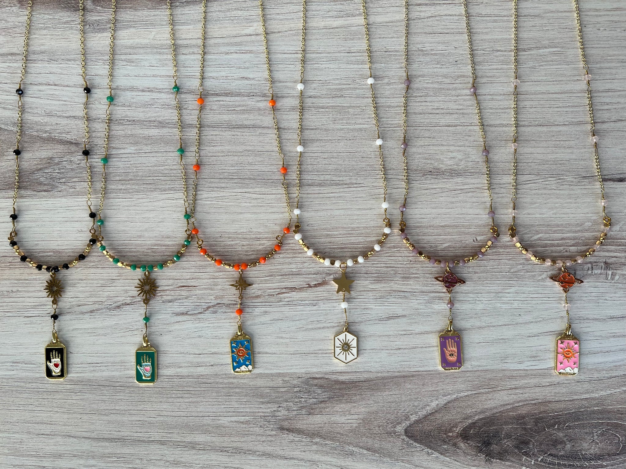 This necklace is carefully handcrafted with durable stainless steel chain and adorned with charming enameled charms and Czech crystals. Each piece is meticulously wire wrapped with the tiniest wire to ensure a stunning look and long-lasting wear. With a length of 20 inches and a pendant drop of 2.75 inches, the Cosmic Fortune Necklace is the perfect accessory to add a touch of elegance and style to any outfit