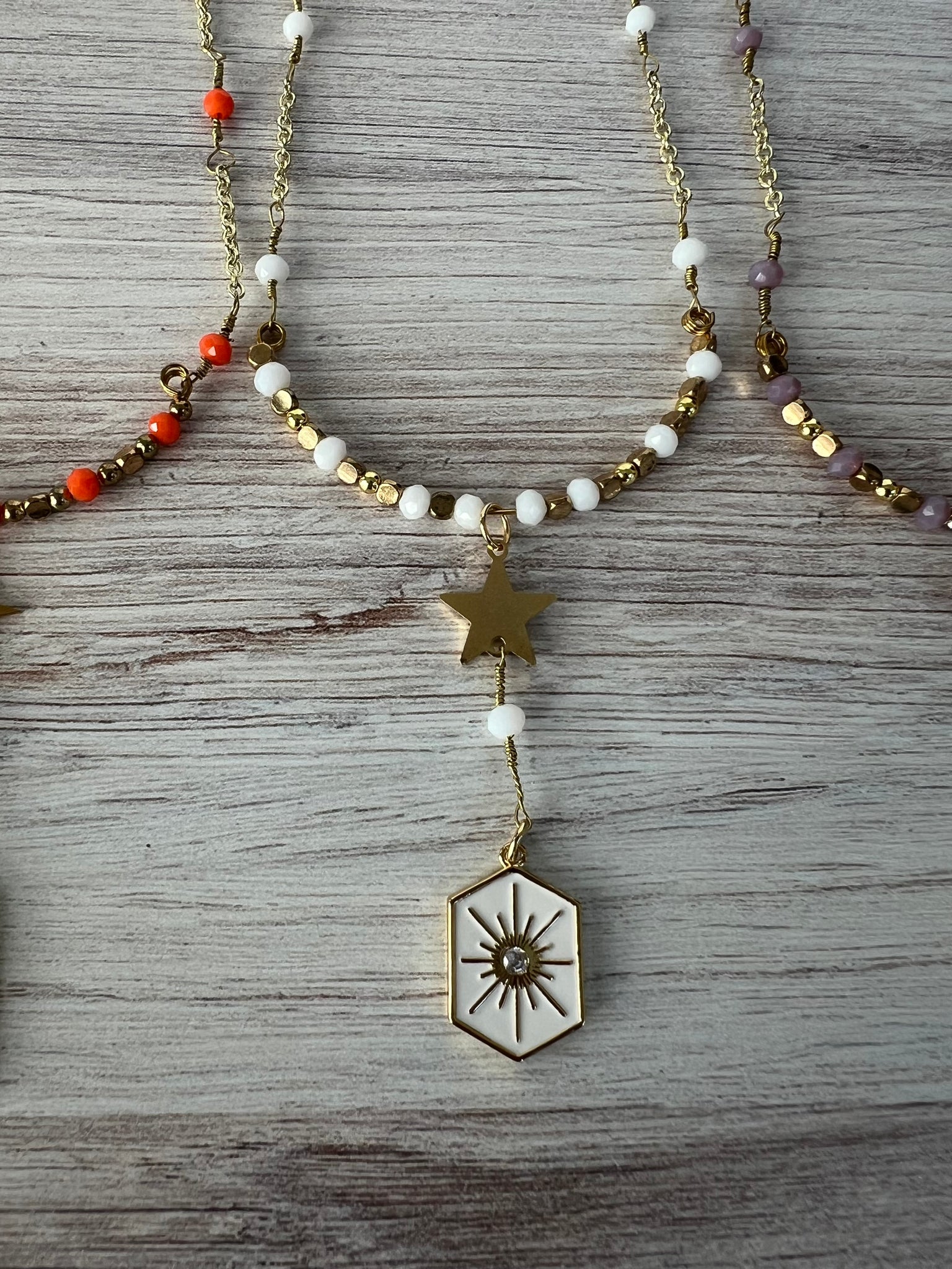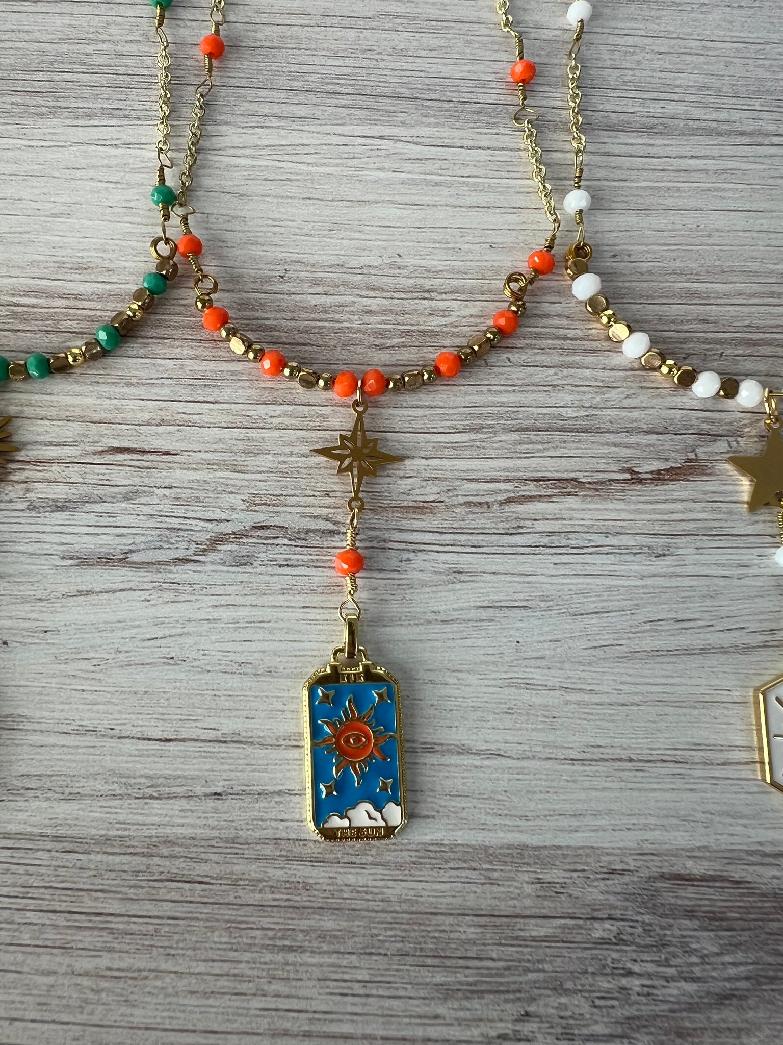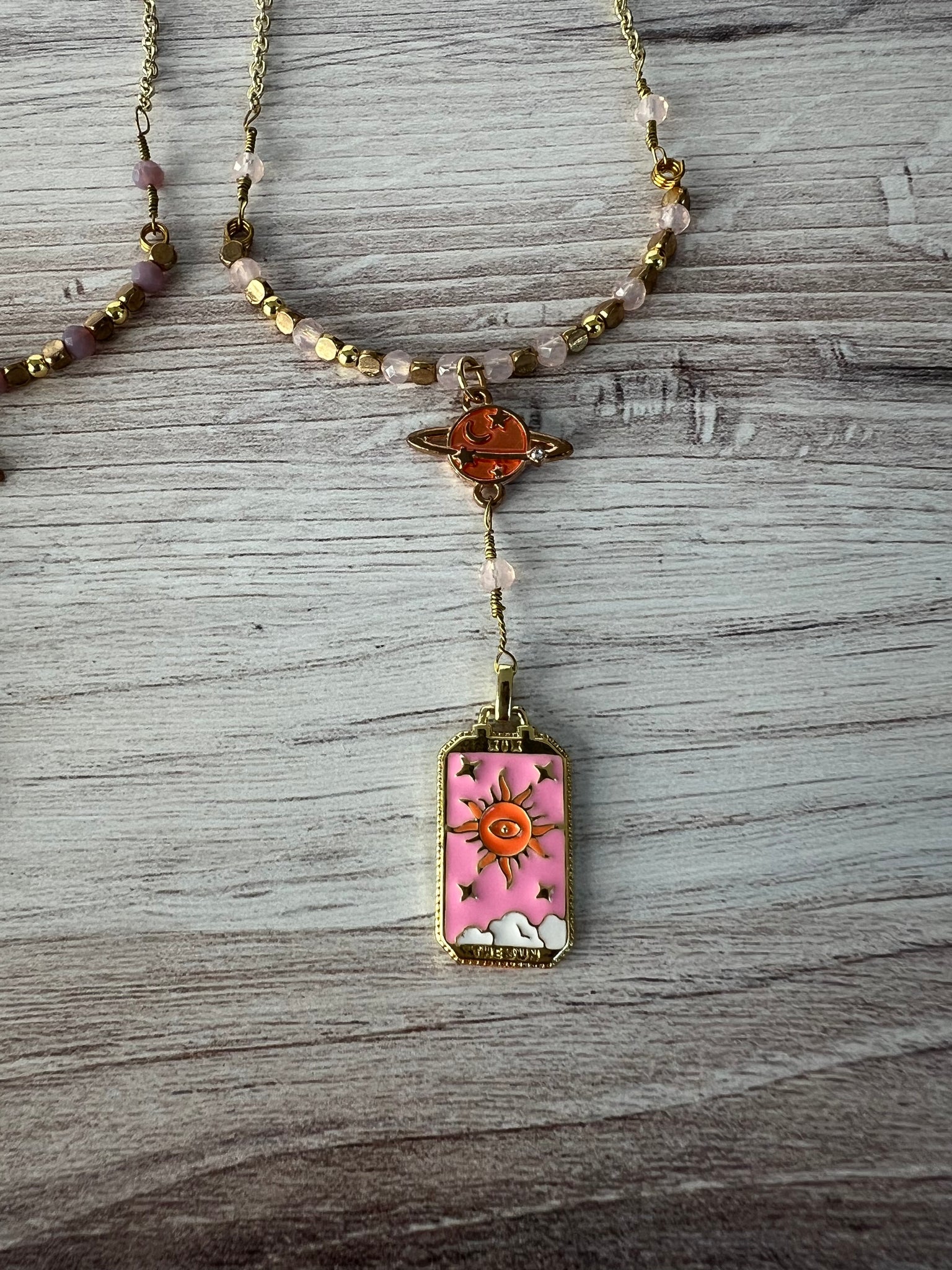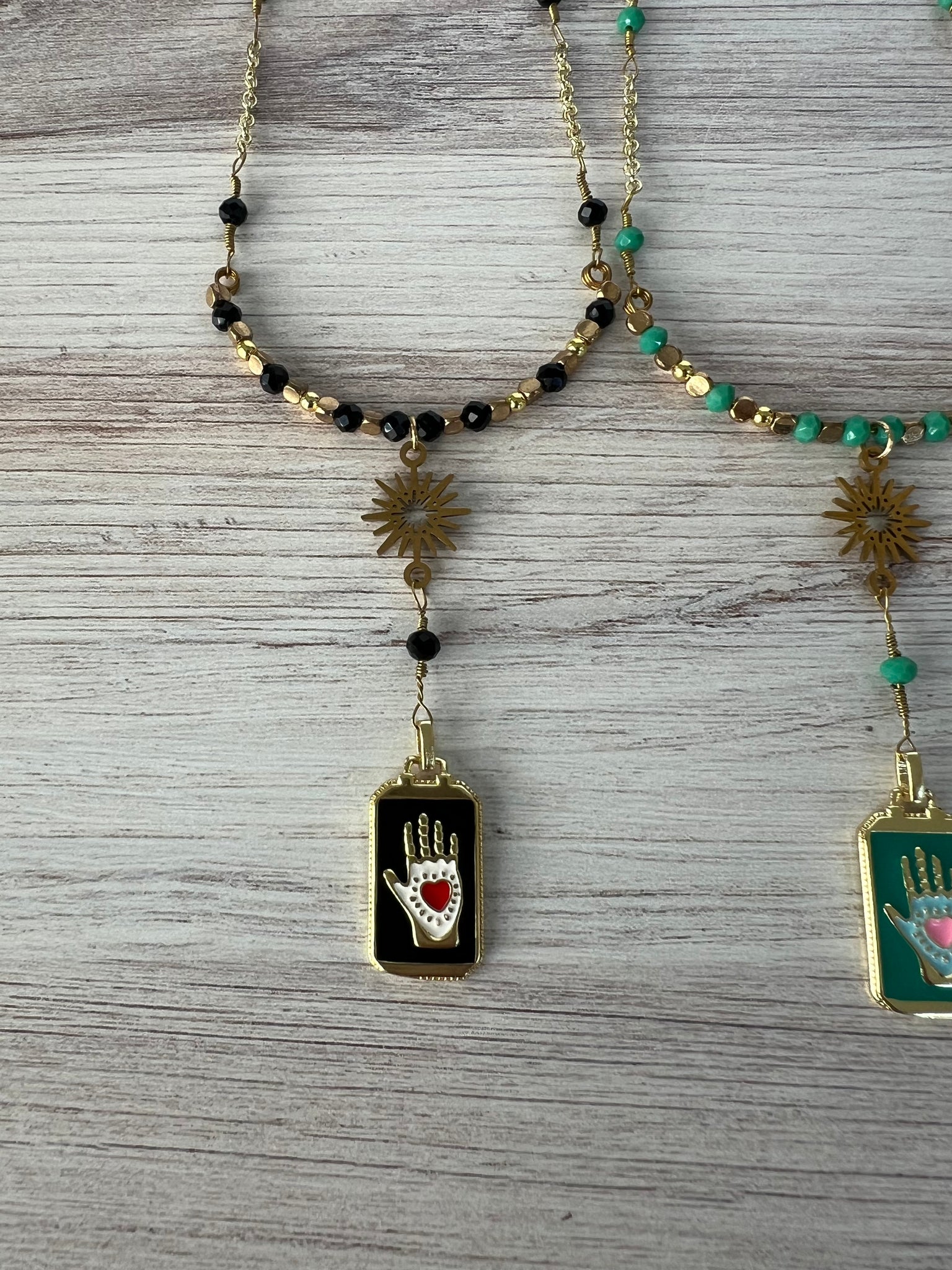 This necklace is carefully handcrafted with durable stainless steel chain and adorned with charming enameled charms and Czech crystals. Each piece is meticulously wire wrapped with the tiniest wire to ensure a stunning look and long-lasting wear. With a length of 20 inches and a pendant drop of 2.75 inches, the Cosmic Fortune Necklace is the perfect accessory to add a touch of elegance and style to any outfit